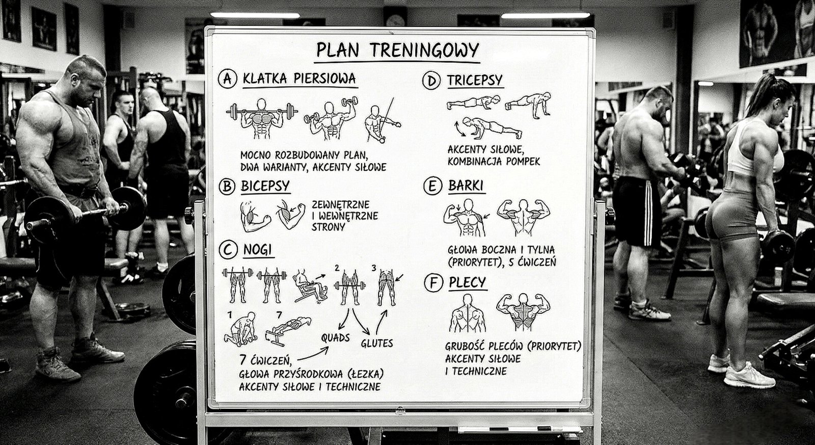 A/ KLATKA PIERSIOWA – mocno rozbudowany plan; klatka podzielona na dwa warianty ( albo wykonujemy oba na zmianę, albo oba trenujemy w jednym tygodniu, np. poniedziałek i czwartek ); cała klatka dokładnie przepracowana; praca ze sztangą, sztangielkami i z linkami; pojawiają się w treningu akcenty siłowe.