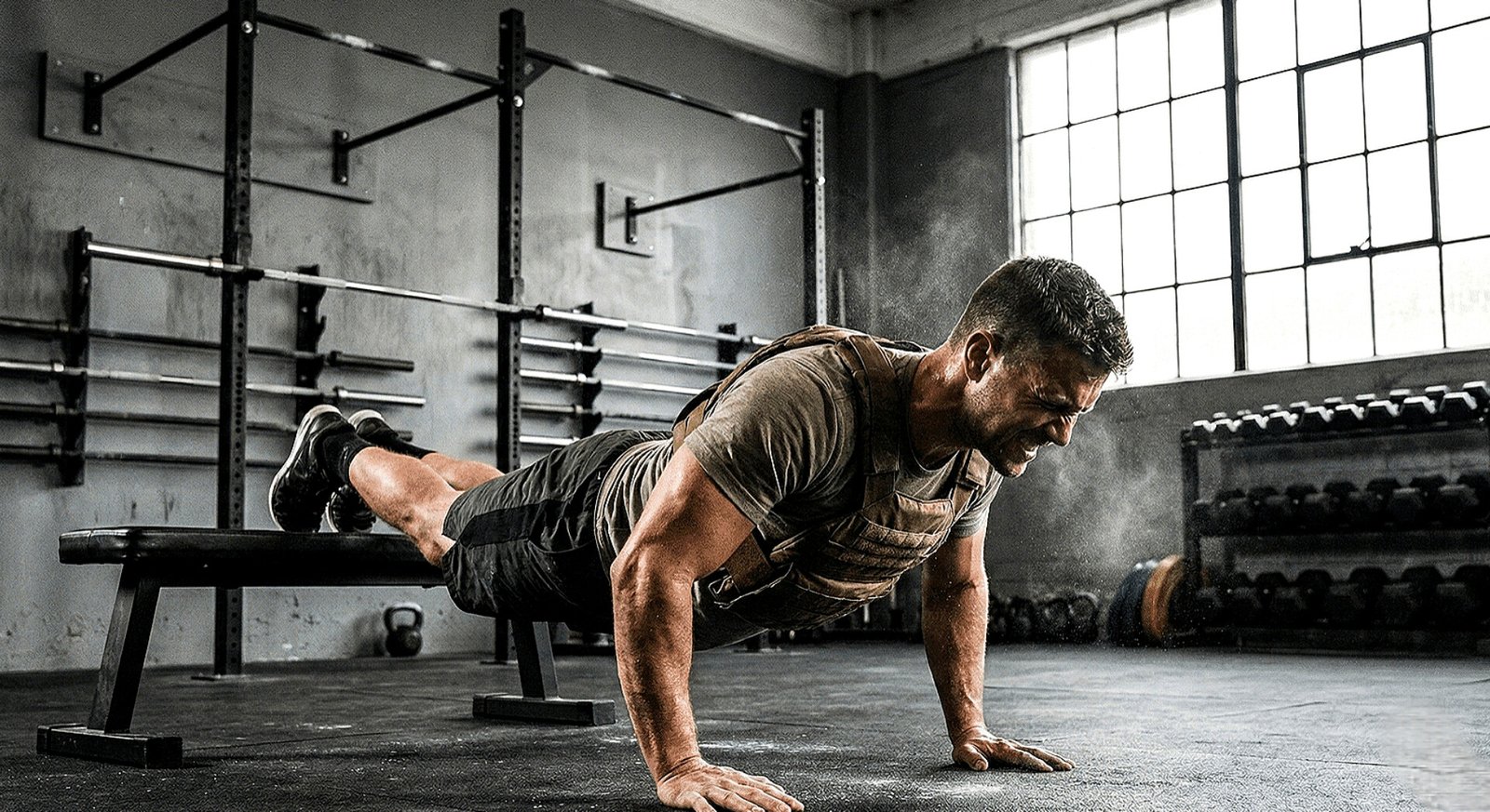 A/ KLATKA PIERSIOWA – zastosowano wstępne i wtórne zmęczenie (pompki i przenosy za głowę), a następnie wyciskania na trzech poziomach ławek – trening mocno wymagający.
